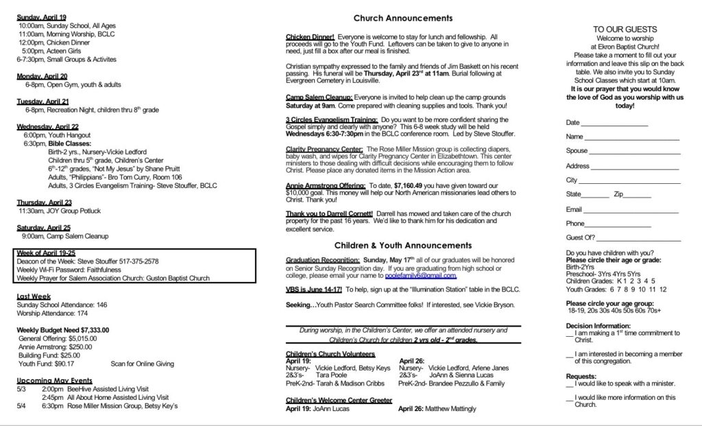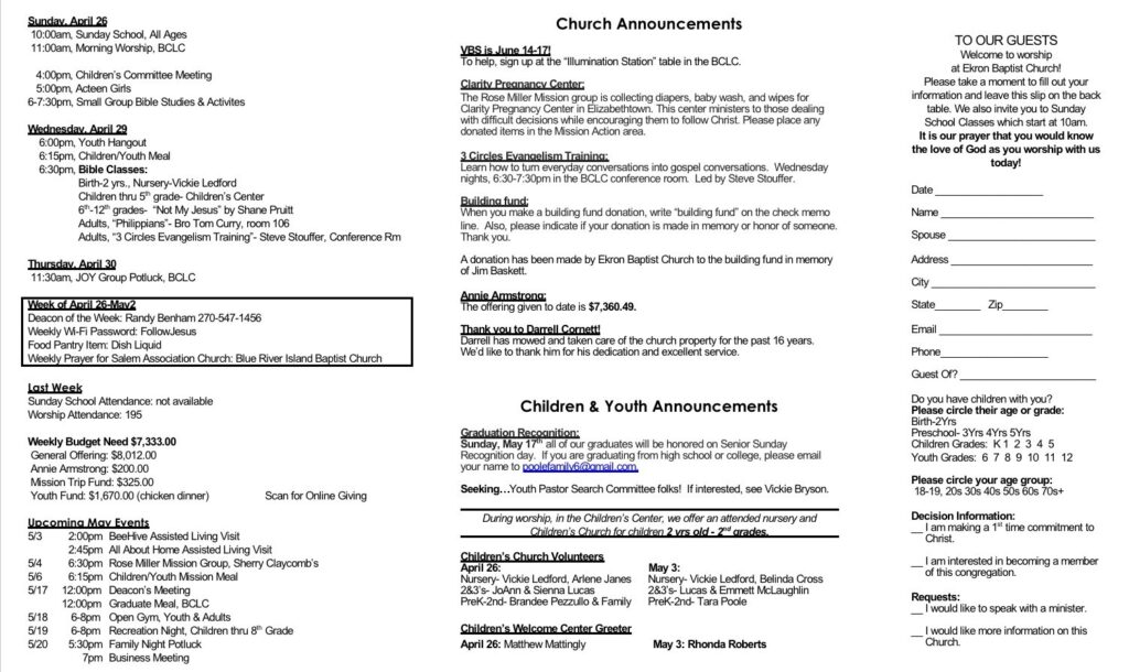 If you are new to Ekron Baptist Church, head over to our frequently asked questions page to get answers on topics like childcare, membership, expectations for worship, and more. If your question isn’t already answered, please send us a message on our contact page.